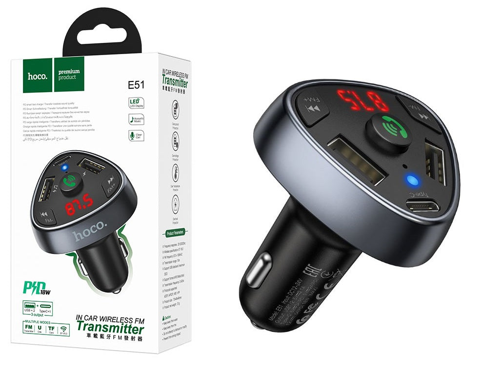 HOCO E51 Road Treasure V5.0 FM Transmitter Dual USB Ports+Type-C Car Charger PD18W